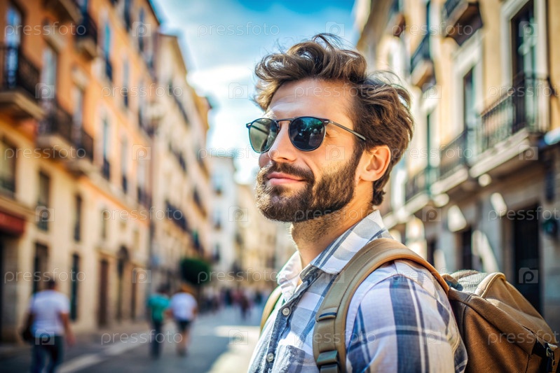 Портрет счастливого красивого хипстера-путешественника с рюкзаком и солнцезащитными очками. Сольное путешествие, образ жизни. Молодой турист наслаждается отдыхом в солнечный день