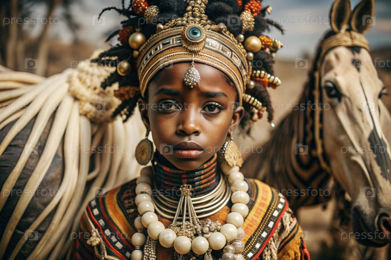 Красивая африканская девушка в традиционном национальном костюме против зебры портрет символизирует традиции и красоту африканского народа