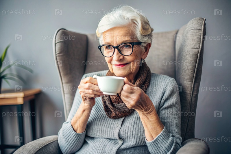 Пожилая пенсионерка, современная бабушка в очках, пьет кофе из кружки во внутренней части гостиной, сидя на стуле дома под естественным светом