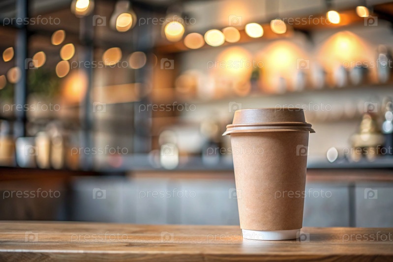 Экологически чистый бумажный стакан для одноразового использования с кофе на столе против размытого фона кофейни