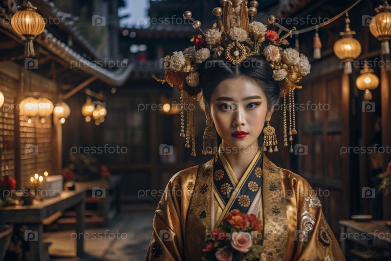 Японская девушка в традиционном национальном костюме - кимоно. На фоне домов, фонарей и вишневых деревьев портрет символизирует традиции и культуру народа Японии