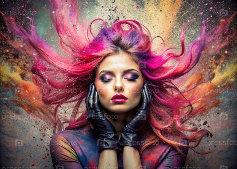 Творческий баннер для салона красоты или парикмахера. Модное профессиональное окрашивание волос. Красивая женщина с длинными розовыми волосами. Взрыв цветов на голове