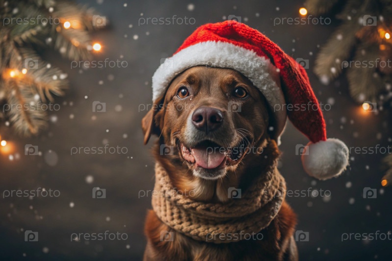 С Новым годом и счастливыми Рождествами! Падает снег. Веселая собака сидит в шляпе Санта-Клауса. Собака ждет праздника