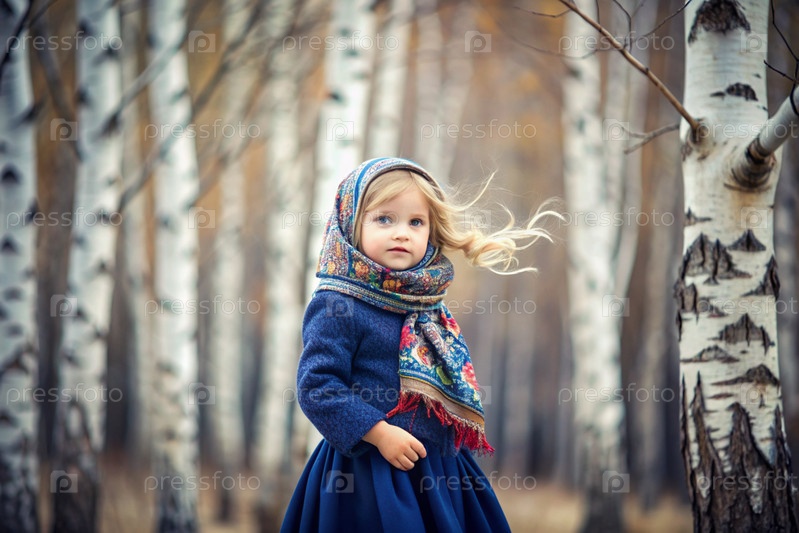 Русские народные традиции.Русский аромат.Красивая девочка в национальном русском платье и шарфе в красивом березовом роще.Портрет прекрасной девушки в березном лесу