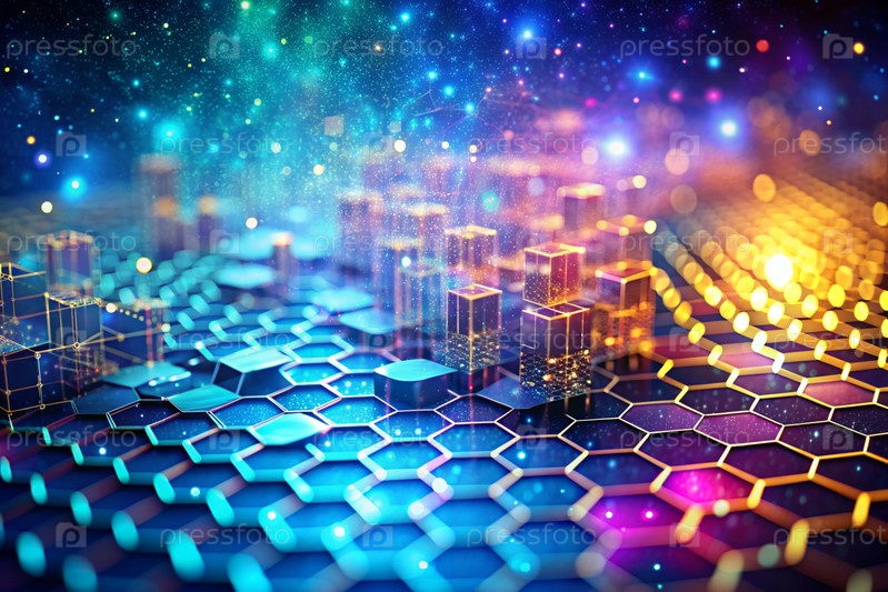 Высокотехнологичный материал. Близкий план клеточного рисунка с многоцветными огнями, создавая абстрактный и футуристический дизайн. Концепция развития и технологии будущего