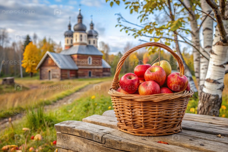 Концепция русского православного праздника Apple resort.Прекрасная плетеновая корзина из виноградных лоз с красными спелыми яблоками на фоне православной церкви