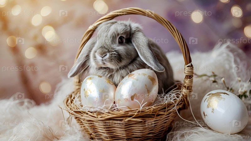 Нежные пасхальные жемчужинные яйца в корзине, кролик и нежные цветы на пастельном аквареле