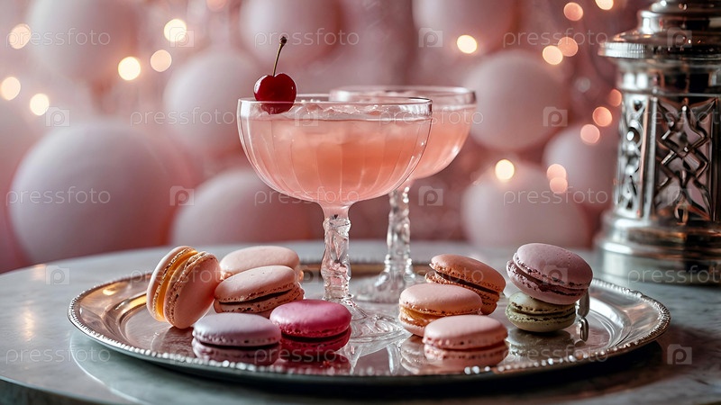 Элегантные мягкие розовые коктейли с льдом и морозом в винтажных бокалах на серебряном подносе с вишней и макаронами