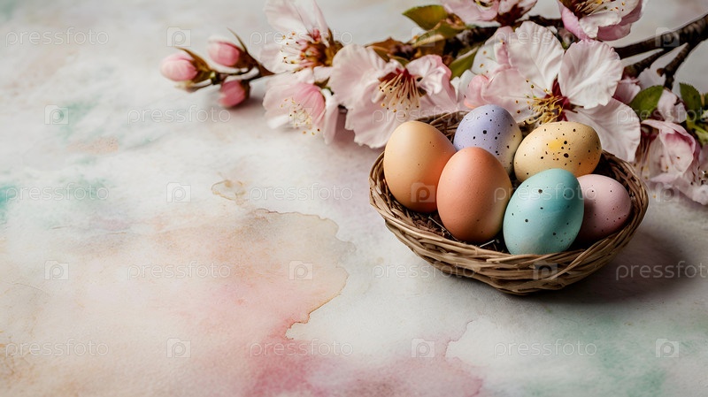 Нежные пасхальные яйца и вишневые ветви цветут на пастельном акварельном фоне с нежными полосками
