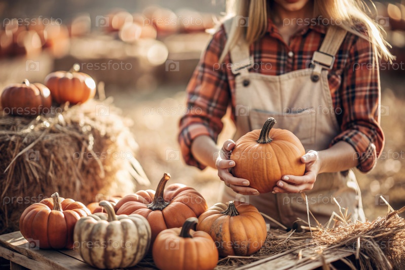 Руки женщины в квадратной рубашке с тыквенным крупным планом и красивым осенним рисунком. Сбор тыков. Концепция празднования Дня благодарения и Хэллоуина