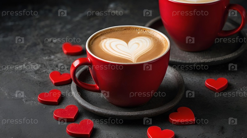 Концепция Дня святого Валентина для кафе и ресторанов красные чашки кофе латте с сердцами вокруг горячие напитки для влюбленных