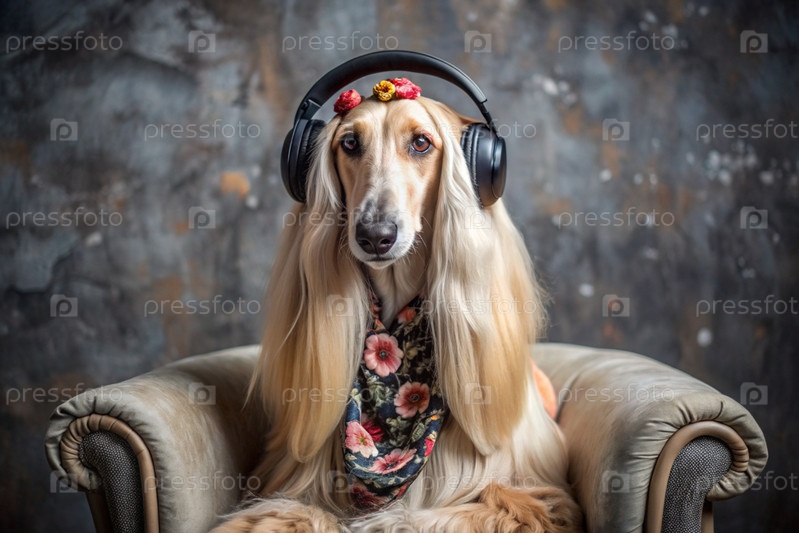 Музыкальный любитель.Афганская собака слушает музыку в больших беспроводных наушниках дома, на стуле в гостиной.Гармония, расслабление и омоложение