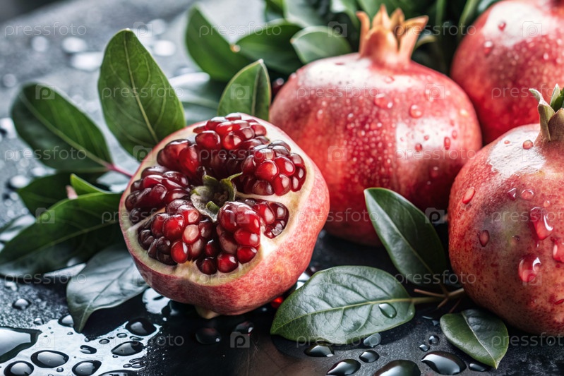 Свежие красные гранаты. Вкусные фрукты ярко-красного цвета с капельками воды. Вегетарианство. Здоровое питание. Свежие плоды на столе