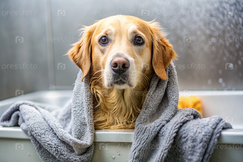 Золотой ретривер купается в пузырьковой ванне. Помыть собаку. Концепция ухода за домашними животными