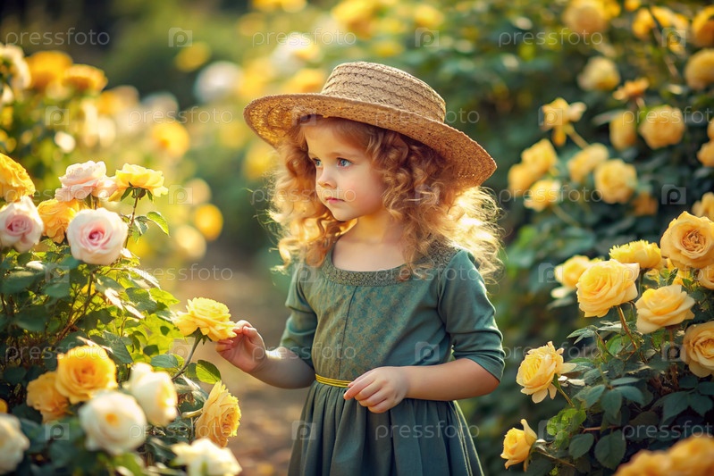 Портрет красивой кудрявой девушки в соломенной шляпе и платье в цветущем розовом саду. Детство. Девочка позирует и смотрит в камеру