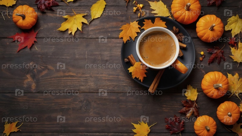 Вкусное тыквенное латте в кружке, тыквы и осенние листья на деревянном столе. Сезонные напитки. вкусный горячий капучино. Осенний баннер