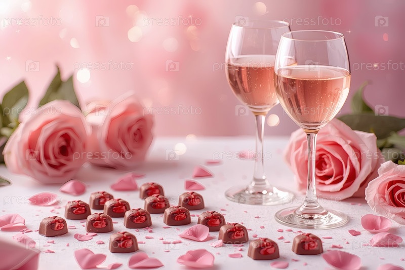 Два бокала розового вина и шоколада в окружении роз и сердец на День святого Валентина