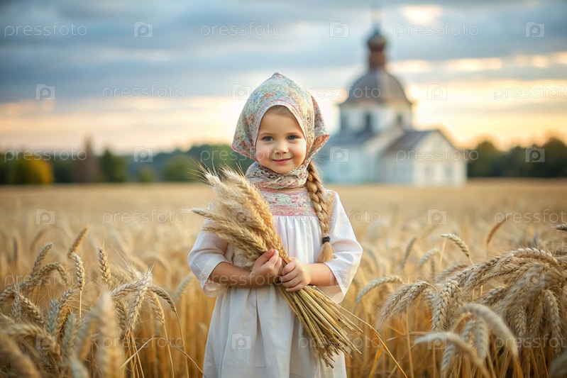 Русская девушка в белом платье и русском полотенце держит золотые колосья пшеницы на фоне созревающего поля и православной церкви