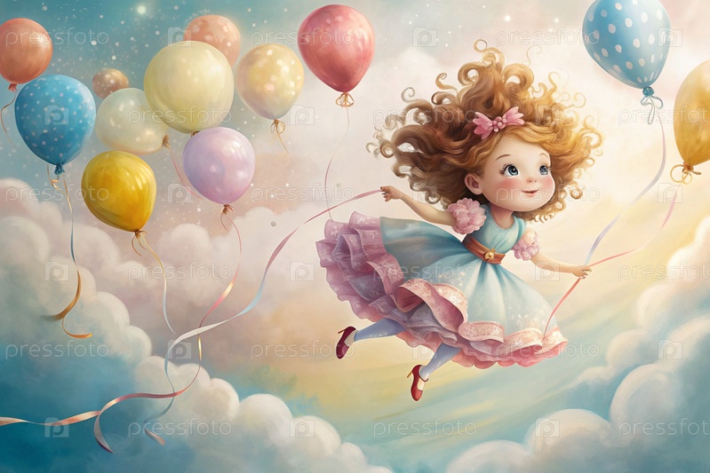 Красивая иллюстрация на день рождения. маленькая кудрявая принцесса в меховом платье и корона с пучкой шариков. детская вечеринка