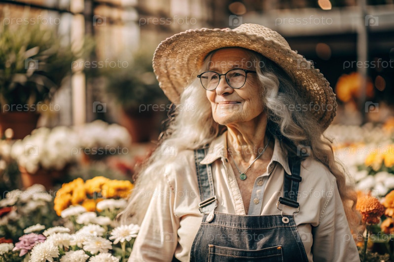 Пожилой садовник с седыми волосами в комбинезоне в уютной цветочной теплице