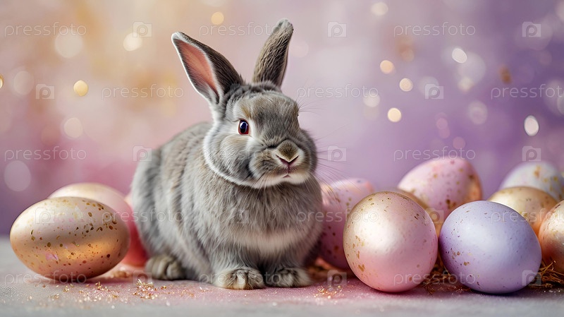 Нежные пасхальные яйца, серый кролик и цветы тюльпанов на пастельном акварельном фоне с нежными венами