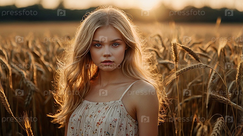 Теплый портрет красивой кудрявой женщины на пшеничном поле при закате солнца. Романтическая, спокойная и чувственная фотография девушки в деликатном платье