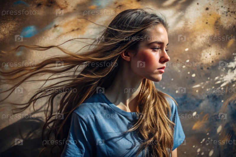 Портрет красивой молодой девушки с продуманным взглядом. волосы развиваются и создают ощущение легкости и естественности