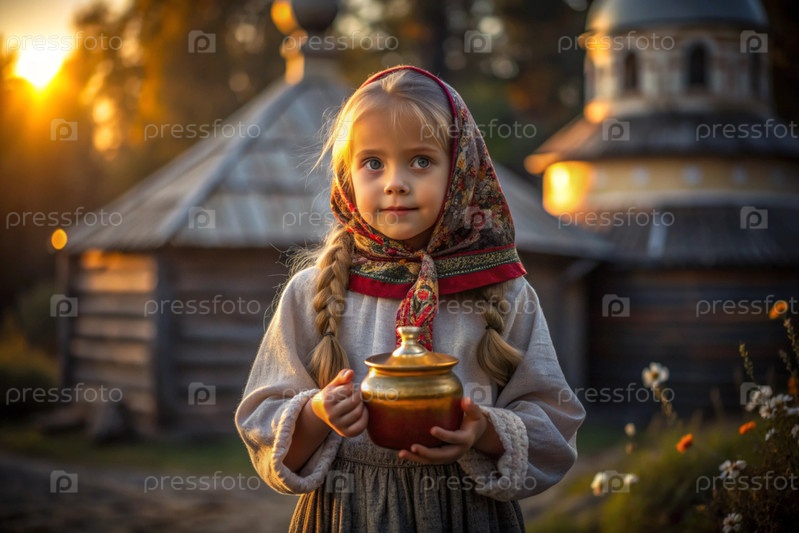 Концепция российского православного праздника 'Мед Спаситель' - красивая маленькая девочка в русской национальной одежде и шарф с баночкой меда на фоне православной церкви