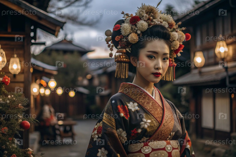 Японская девушка в традиционном национальном костюме - кимоно. На фоне домов, фонарей и вишневых деревьев портрет символизирует традиции и культуру народа Японии