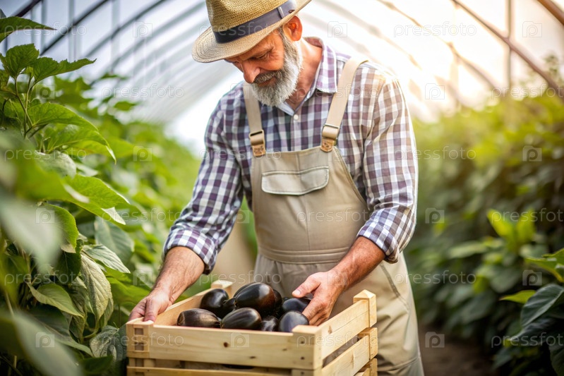 Сельскохозяйственная промышленность. деревянный ящик с баклажанами в руках фермера. садовник собирает богатый урожай в теплице