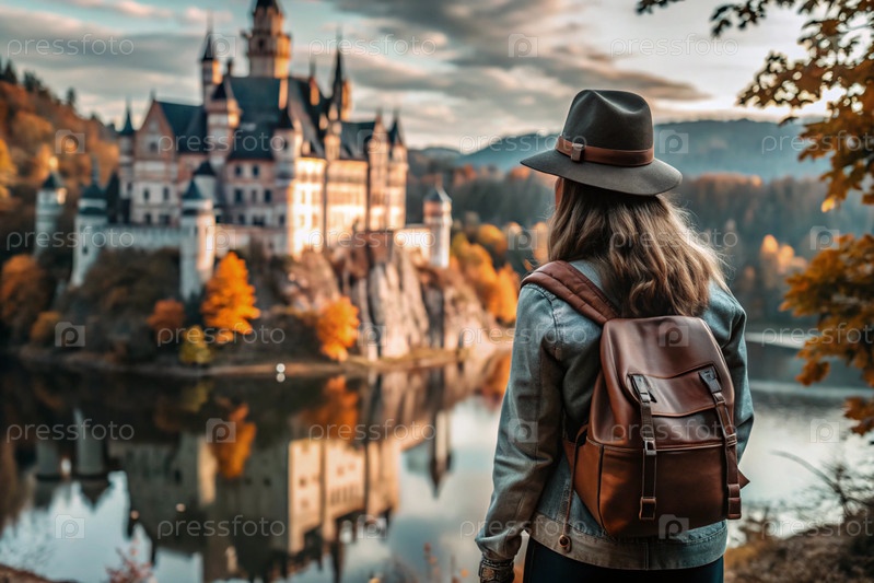 Девушка-путешественница с рюкзаком на фоне огромного замка в осеннем лесу в горах. он путешествует и наслаждается жизнью и окружающей средой. туризм