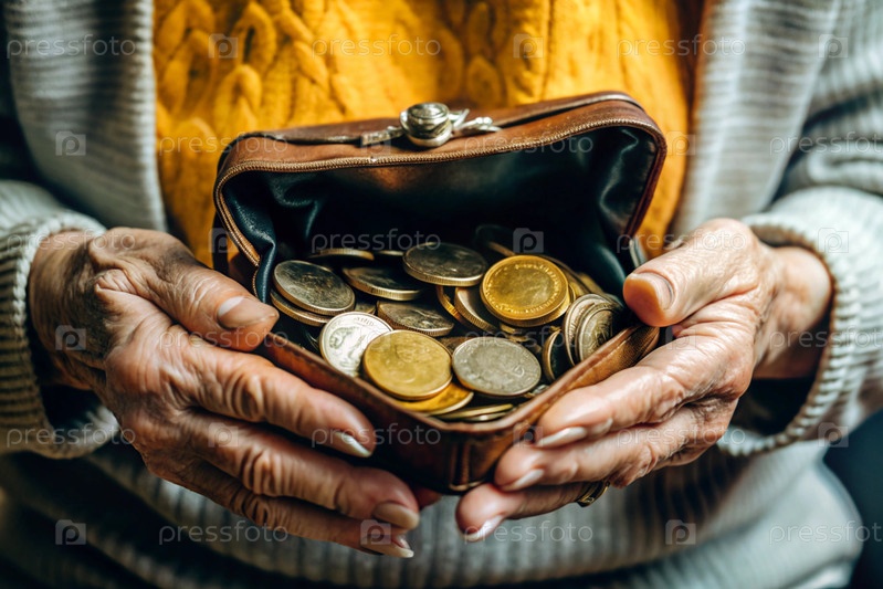 Бедность, проблемы с пенсией. Пожилой пенсионер держит старый кошелек. Последние деньги, трудности. Семейный бюджет с низким уровнем дохода