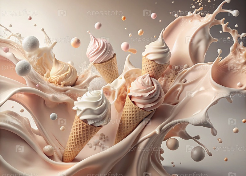 Абстрактная композиция с таяющим мороженым. Плески и брызги мороженого. натюрморт, изображающий перевернутый конус мороженого на светло-розовом фоне