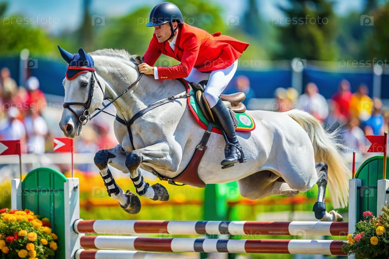 Близкий план олимпийской лошади и всадника, перепрыгивающих через препятствие на открытой арене - это конная езда