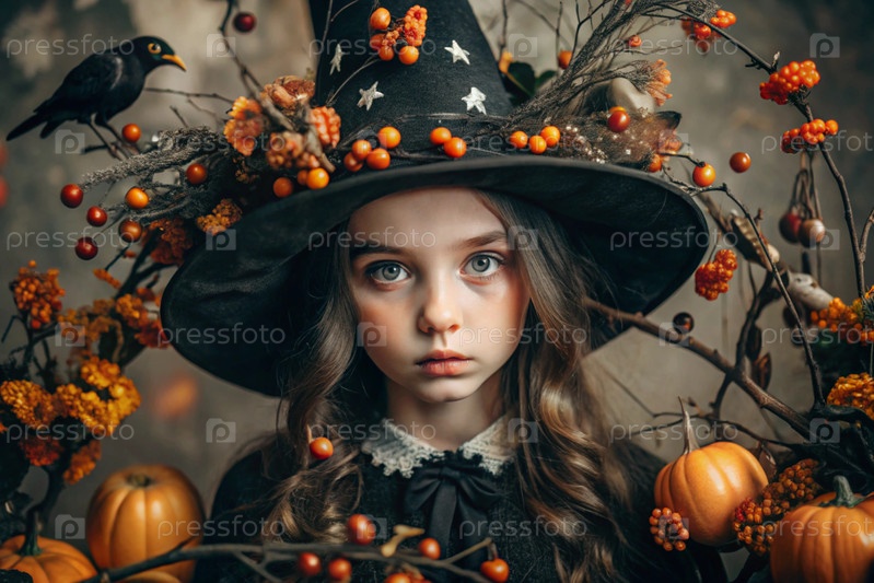 Осенний портрет красивой девушки в костюме ведьмы с осенними ягодами, тыквами и черными птицами. баннер, открытка. концепция Хэллоуина