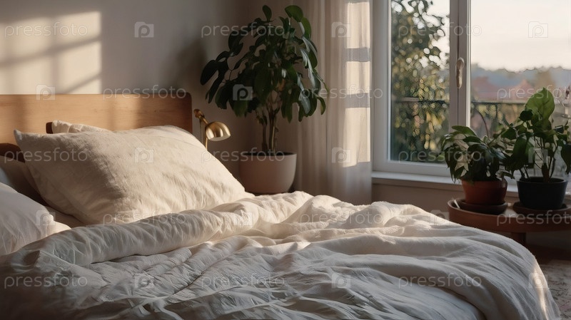 Интерьер современного дома.Минималистский уютный бежевый интерьер спальни с клеткой, подушками, головной доской, полотном и ночным столом
