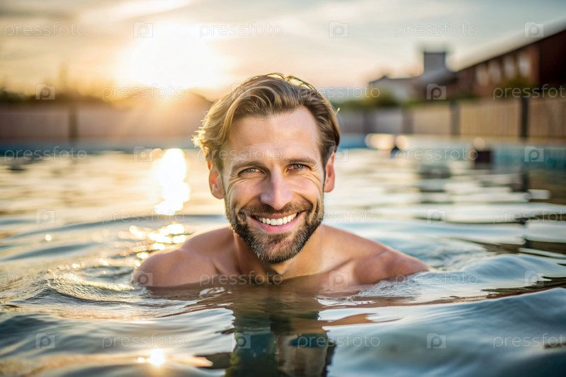 Красивый молодой человек плавает и тренируется в отопительном бассейне, счастливая улыбающаяся девушка