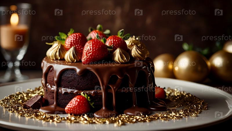 Концепция праздничных блюд. Пекарня. Красивый вкусный торт со свежими клубниками и шоколадом на столе. День рождения и сладости