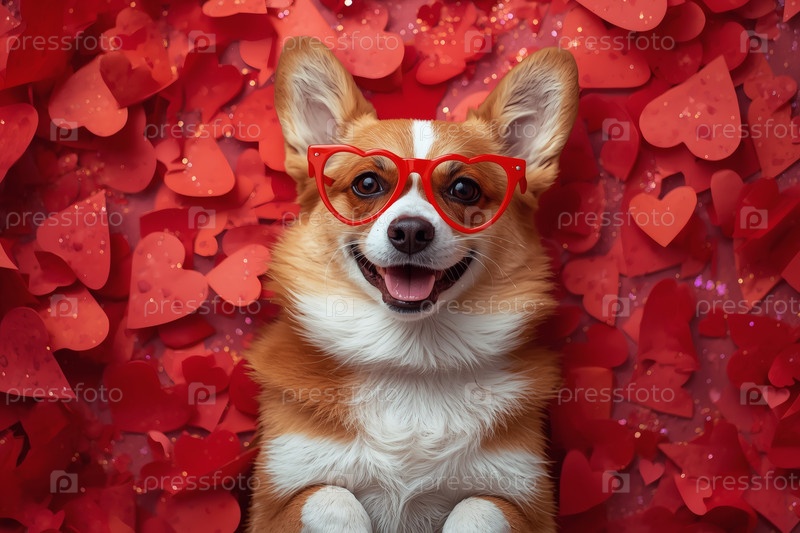 Красивый баннер на День святого Валентина с влюблёнными собаками и красным сердцем. Вид сверху. Романтическая и любящая атмосфера