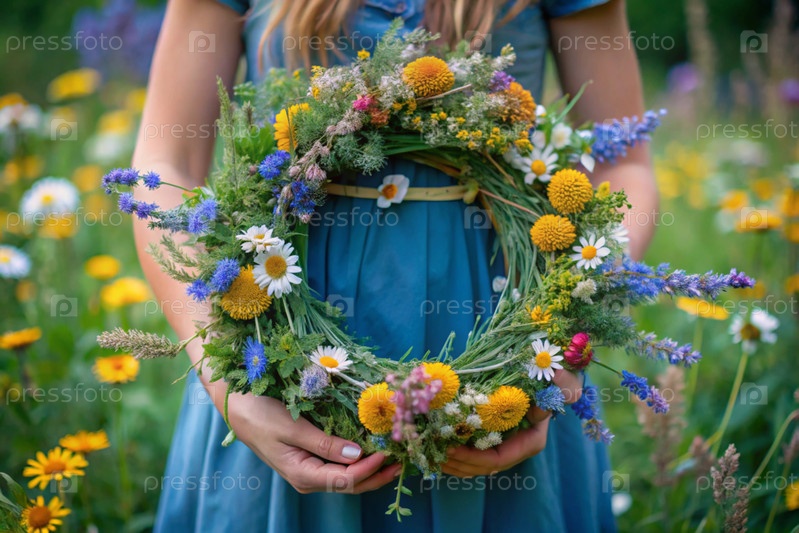 Красивый летний венок из диких цветов в руках девушки.Летняя весна. Летнее солнцестояние. Праздник Ивана Купалы