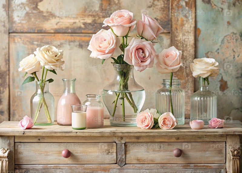 Красивые розы в стеклянных вазах и флаконах на древнем деревянном шкафчике Букет цветов в вазе в интерьере дома Светлый, бежевый, розовый цветочный фон