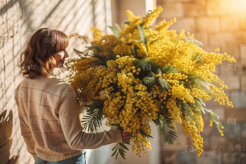 Красивая девушка с пушистым букетом мимозы. Близко Концепция весны и Международный женский день 8 марта