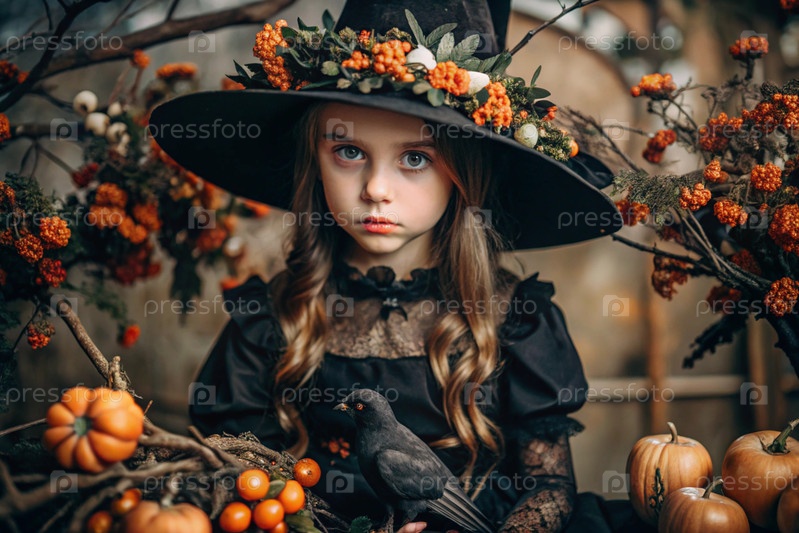 Осенний портрет красивой девушки в костюме ведьмы с осенними ягодами, тыквами и черными птицами. баннер, открытка. концепция Хэллоуина