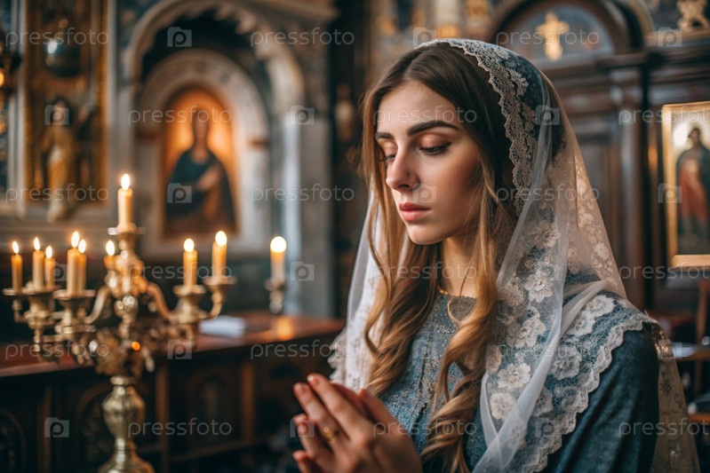 Портрет красивой молодой женщины с платками в православной церкви.Девушка молится в церкви среди икон