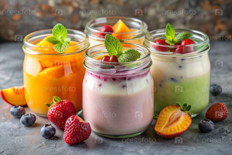 Разнообразный домашний йогурт с различными свежими ягодами и фруктами в стеклянных банках на стильном сером фоне