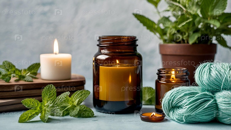 Дизайн удобно горящей стеклянной свечи с пустой белой этикеткой и зелени в интерьере дома