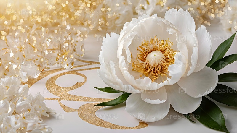 Пеони - это летние ароматные цветы. Красивый цветочный фон с красивым эффектом боке. Нежные белые бутончики пеони на фоне белого аквареля со золотыми венами