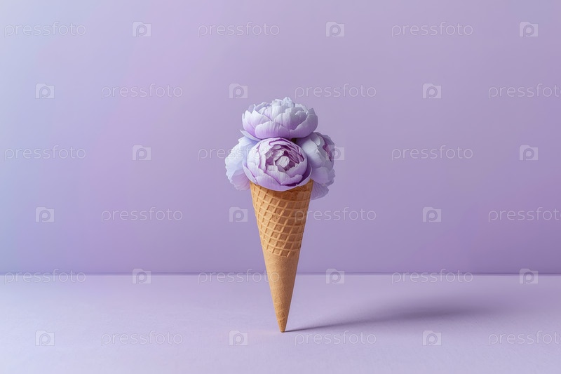 Минимальная студийная фотография. Вафельный конус. Наполненный тонкими пастельными цветами, напоминающими пионы или розы, с многослойными лепестками в мягкой сирены и голубыми оттенками на фиолетовом фоне