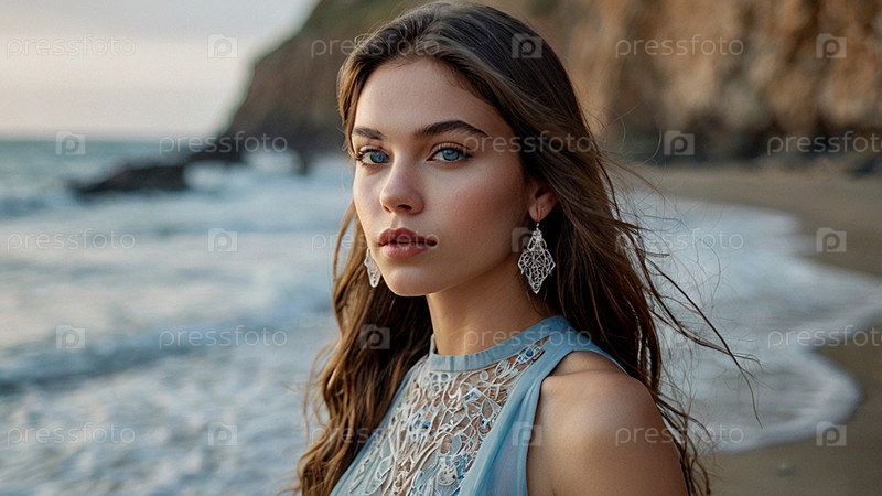 Портрет красивой женщины на пляже перед морем.Романтическая, спокойная и чувственная фотография девушки в проветренном нежном платье