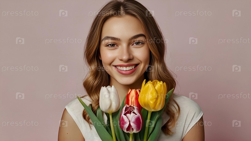 Баннер.Девушка держит красивый букет тюльпанов.Поздравительная открытка на 8 марта и Международный женский день.Концепция поздравлений и празднований